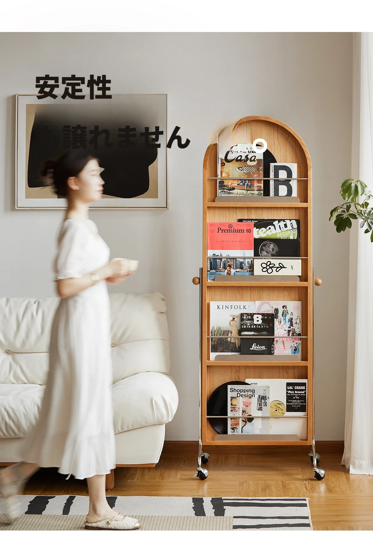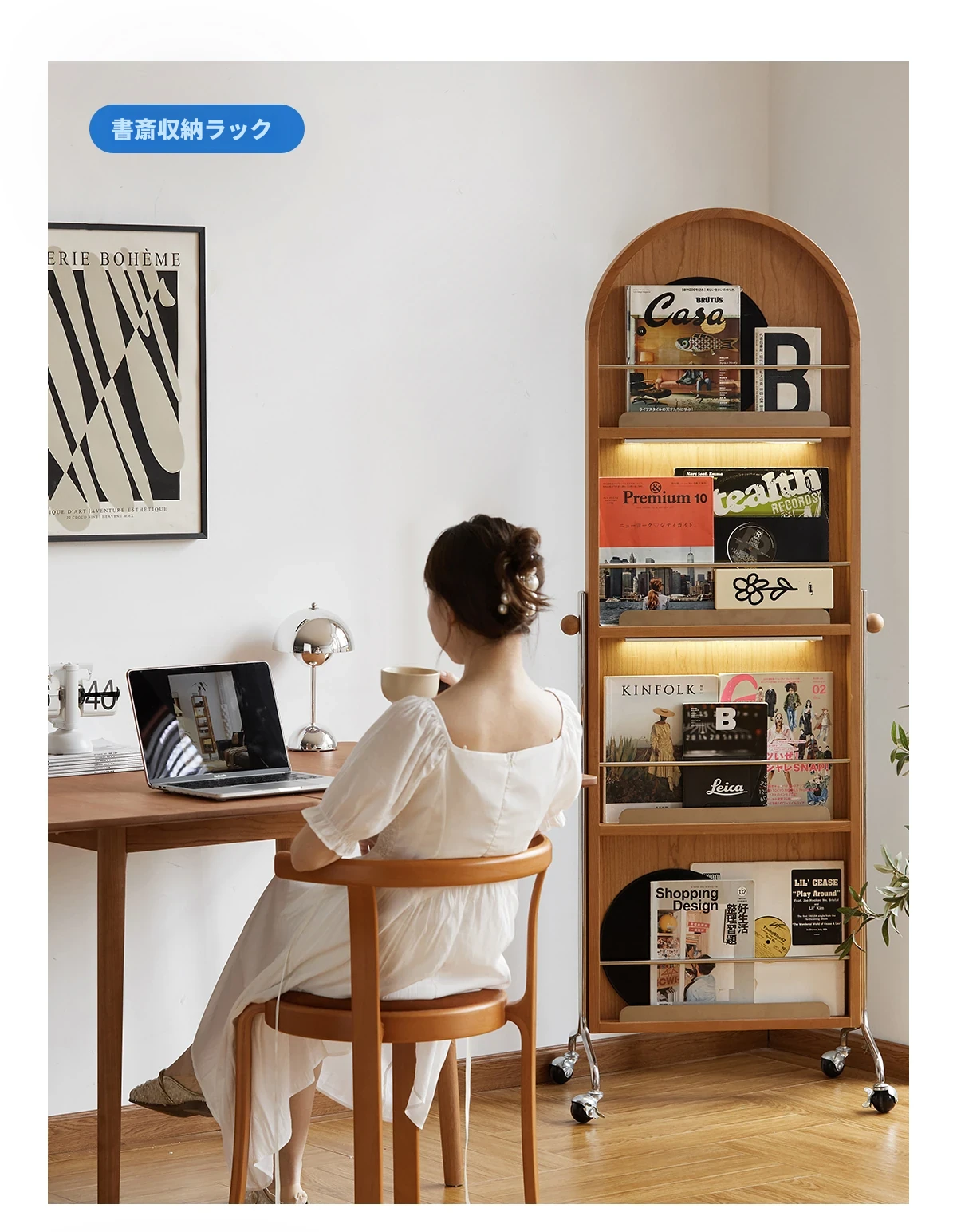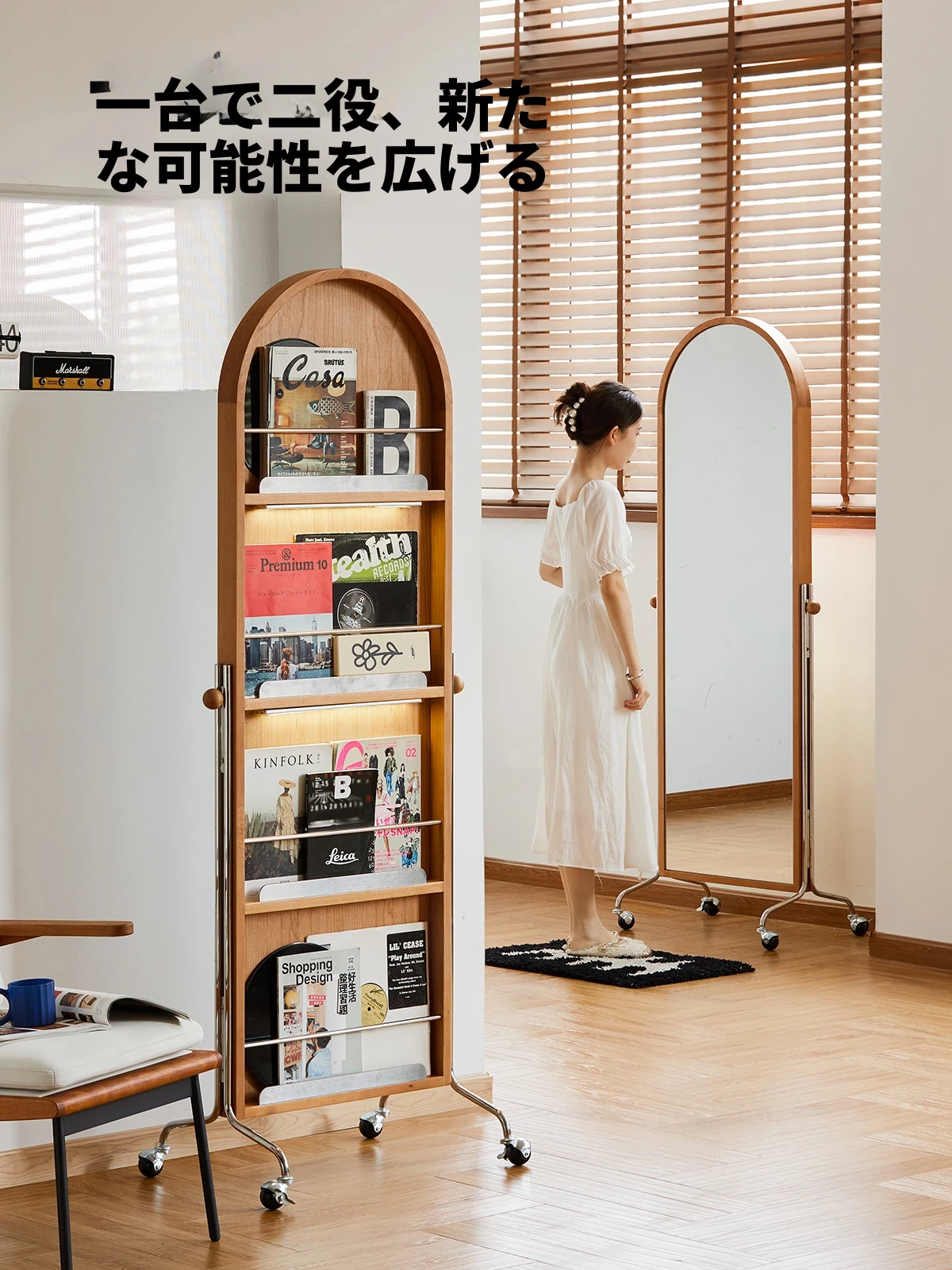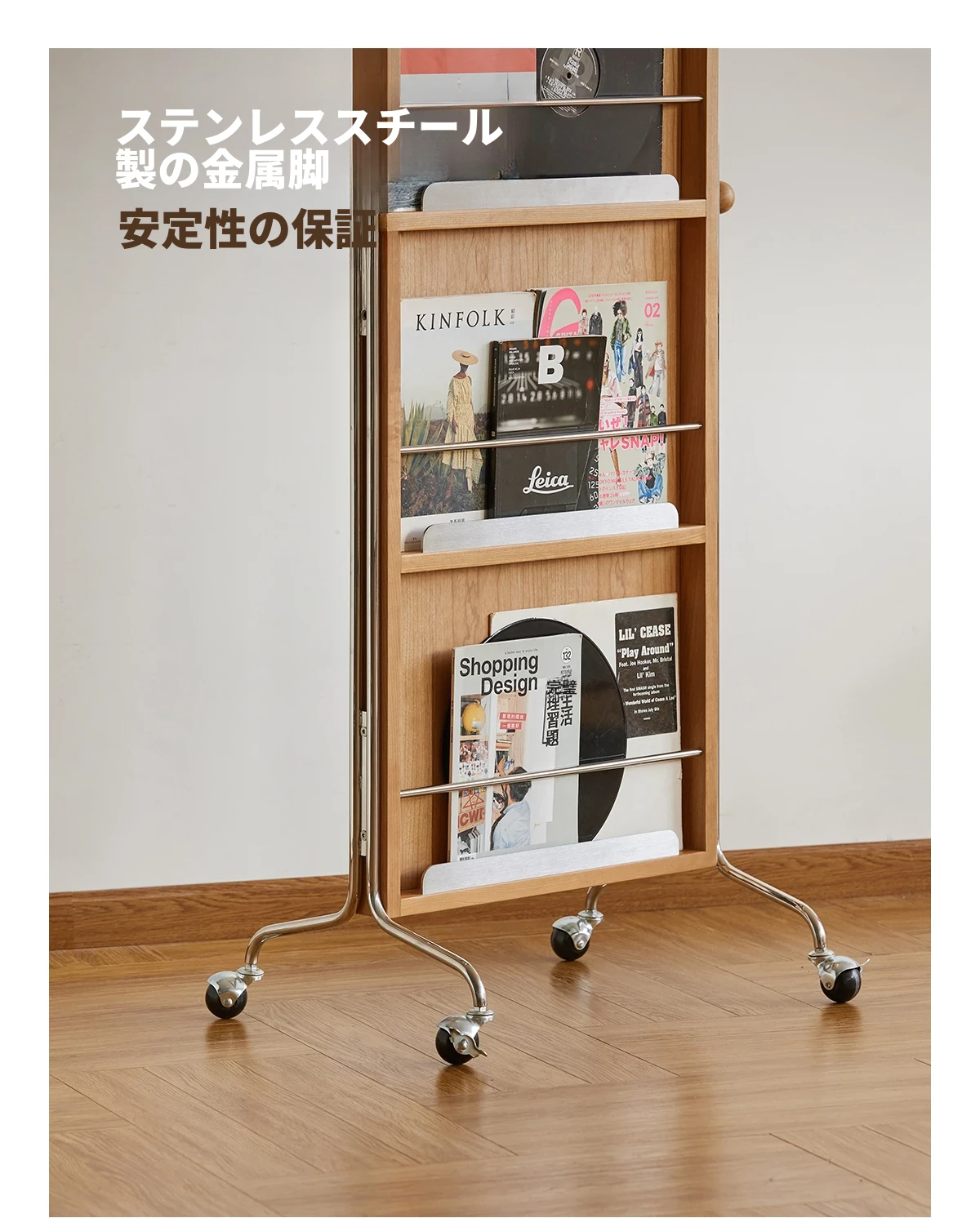 【魅力たっぷり】小半木材使用の移動式収納キャビネット&マガジンラック家具